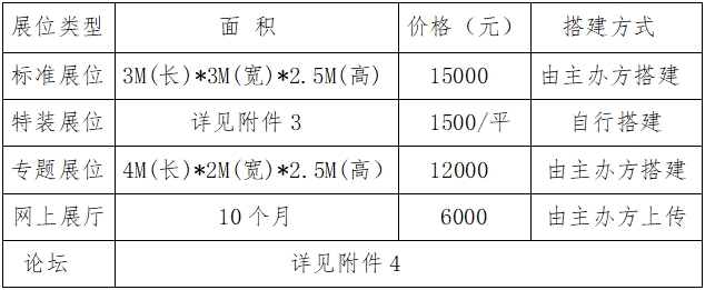 说明:标准展位9 M²(3*3),包括三面展板、一张洽谈桌、两把椅子、两支射灯、一个220V*5A电源插座、地毯(需向主办单位提供展位楣板文字,参加线下展赠送网上展)。