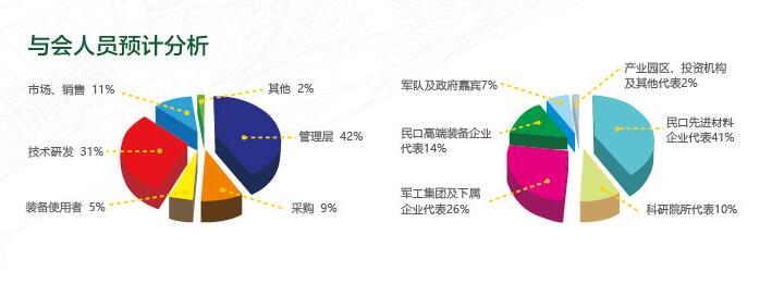 1、军工企业观众:中国核工业集团、中国航天科技集团、中国航天科工集团、中国航空工业集团、中国船舶工业集团、中国船舶重工集团、中国兵器工业集团、中国电子科技集团、中国兵器装备集团、中国航空发动机集团等各军工集团及其下属企事业单位、国防科技工业系统内大专院校及科研院所。