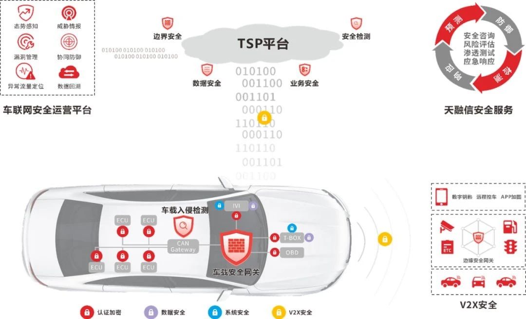 天融信在车联网安全领域始终坚持自主创新,长期致力于智能网联汽车安全标准建设、安全技术研究与相关安全产品研发。依托天融信在网络安全领域领先的技术优势,融合车联网安全业务场景,建立涵盖车联网终端安全、通信安全、业务安全、数据安全的纵深防护体系。推出一体化威胁防护与车联网业务融合的车载防火墙、符合国密的轻量级车内关键组件间认证加密系统、支持与云端车联安全态势感知平台联动的车载入侵检测产品。同时,通过云端车联网安全运营平台的持续建设与车联网安全攻防的深入研究,为客户提供可持续演进的安全能力,助力中国智能汽车产业发展。