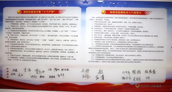 为深入贯彻执行新时代政法干警“十个严禁”,大力加强阜阳市检察院廉洁文化建设,一体推进不敢腐、不能腐、不想腐向纵深发展。阜阳市检察院结合新修订的《阜阳市检察机关十六条禁令》制作《“十个严禁”暨“十六条禁令”》签字承诺墙。