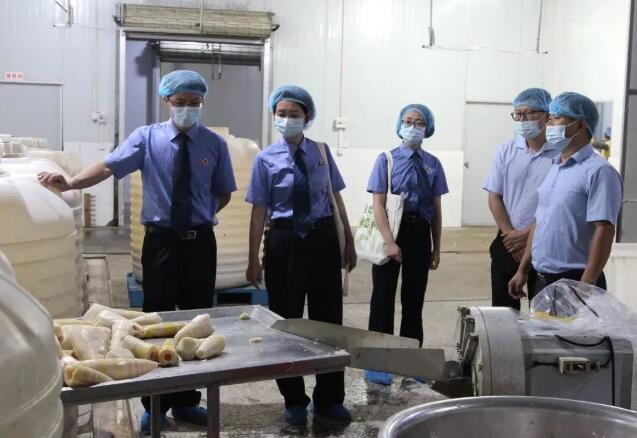 在广西农业龙头企业柳州市石山脚农业科技有限公司,工作组详细了解麻竹笋清洗、腌制、切片等酸笋制作流程,并围绕竹笋种植技术、市场前景、企业当前面临的困难进行座谈交流。