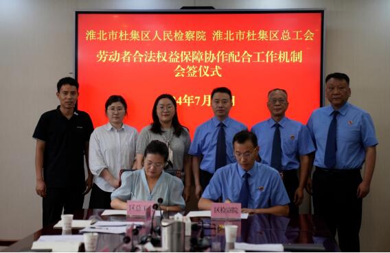 会上,杜集区总工会副主席丁学芳详尽阐述了工会在推进法治化建设、保障劳动者权益及构建协作机制方面的成果与规划。随后,杜集区检察院副检察长祁森介绍了“检察蓝”项目在助力劳动者权益保护领域的具体实践与成效。双方基于共识,正式签署了《劳动者合法权益保障协作机制合作框架协议》,标志着双方在劳动者权益保护上的合作迈入新阶段。