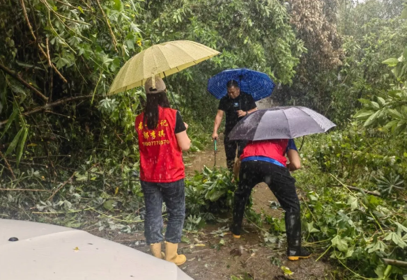 9月7日上午,钦州市钦南区检察院驻村工作队队员冒雨清理掉落路面的树枝,保障群众出行安全。