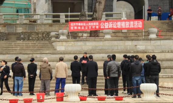 叠彩区检察院联合市农业农村局组织10名涉案当事人在漓江边开展了公益诉讼增殖放流活动,并邀请村民代表参加。