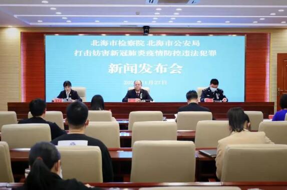 1月27日,北海市检察院、北海市公安局联合举行打击妨害新冠肺炎疫情防控违法犯罪新闻发布会,通报新冠疫情发生以来北海市办理妨害疫情防控犯罪案件情况及典型案例,并回答记者提问。