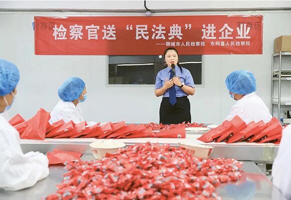 山东省聊城市东阿县人民检察院在该县阿胶行业协会设立了“阿胶品牌保护检察服务站”,精准提供法律服务,护航民营企业发展。图为2021年8月11日,山东省聊城市人民检察院与东阿县人民检察院干警联合走进相关企业,为职工讲授民法典知识。最高人民检察院供图