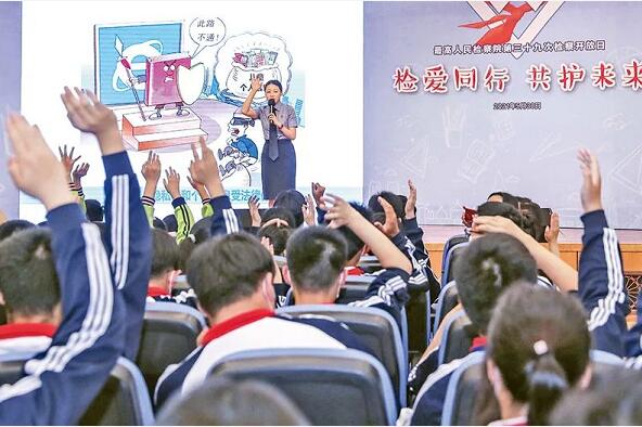 2021年5月30日,在新修订的未成年人保护法和预防未成年人犯罪法即将正式施行之际,最高人民检察院举办以“检爱同行 共护未来”为主题的检察开放日活动。图为在开放日活动的法治教育课上,工作人员与学生互动。殷刚 摄