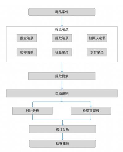 在办理涉毒案件时,首先通过标题识别筛选出各个笔录,再通过自然语言推理技术自动识别出笔录中的要素,系统自动对要素进行对比分析生产分析结果,检察官再次对分析结果进行审核确认。每次办理的结果系统会自动保存,已承办单位、侦查单位、侦查人员等不同的维度统计分析,得到办理涉毒案件取样不规范的趋势变化、取样不规范案件量占比分析、违规条例占比分析等,检察官根据分析结果对相关单位及个人提出精准度高的、公信力大的、时效性强的检察建议,强化检察院对毒品取样规范化的法律监督。下图为主要的分析流程图。