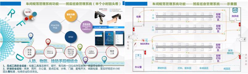 “智慧车间规范化管理系统平台”通过使用传感器、网络通讯、人员定位、红外感应、语音视频系统等技术把监管场所生产管理过程中的五大要素“人”、“机”、“料”、“法”、“环”信息与网络连接起来,进行数据信息交换和通讯,通过服务端云计算的分析和统计实现对生产管理五大要素智能化识别、定位、跟踪、监控和管理,从而真正让车间变成信息无所不在、无所不通的全数字化、信息化的智慧化车间,满足了监管场所内的生产安全监控、指挥调度与及时获取生产决策辅助信息的需求。