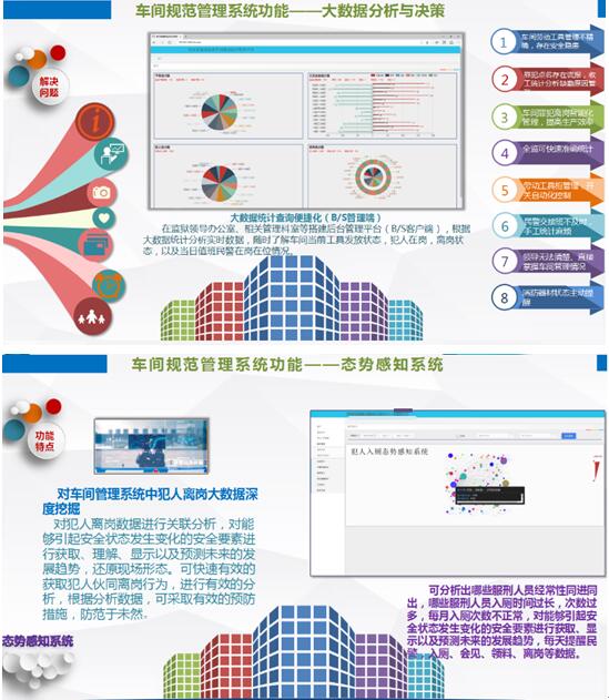 该系统已在山东省鲁南监狱落地运行。其主要依托智慧监狱规范化监管平台通过互联网云数据中心、物联网感知系统、大数据分析系统、人工智能管理大平台、网络信息安全体系等新一代科技技术,聚集诸多先进理念与元素,与监狱企业生产、业务工作深度融合,最大限度汇集整合、感测分析监管改造、生产管理和社会信息,形成智慧安防、智慧矫正、智慧执法、智慧警务、智慧生产、智慧管理一体化运行系统,能够有效地实现促进科技强警、以科技解放警力。便于民警作为一个管理者,更深入参与生产管理管控,参与进生产和业务中,专业于品质工艺把控。将监狱民警培养成等同社会工厂的中层管理干部,并且在劳动改造过程中,不影响犯人的生产秩序和生产效率。