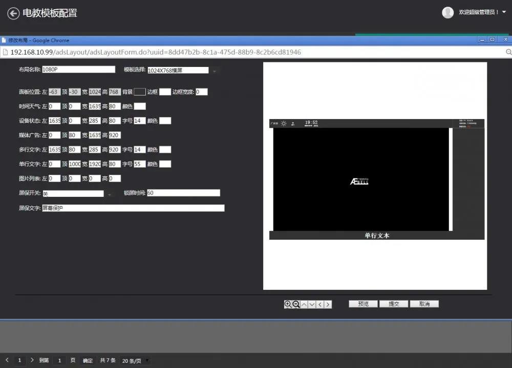 布局自定义:支持对终端的播放界面布局自定义位置和窗口大小,包括当前时间信息、运行状态、字母叠加、通知栏以及视频播放窗口的自定义设置。
