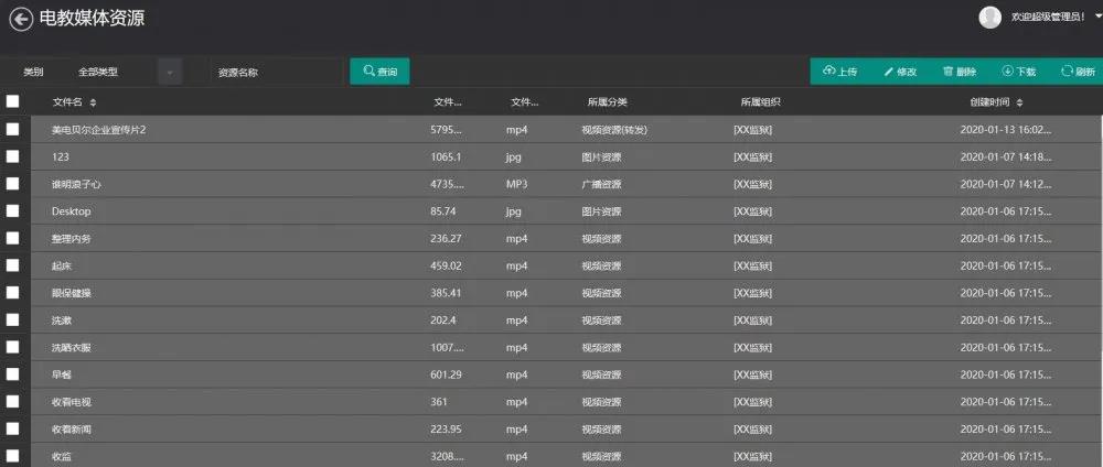 音视频资源管理:平台媒体资源菜单中可对所有音视频和图片等文件进行一体化管理,支持自定义上传各种类型的多媒体文件。