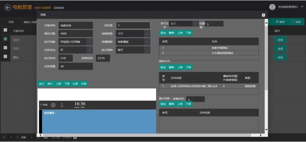 电教任务发布:支持自定义添加音视频播放任务,可在一个任务中定义行文本通知,视频资源和文本字母显示等。添加完成,可根据设定时间进行自动播放。