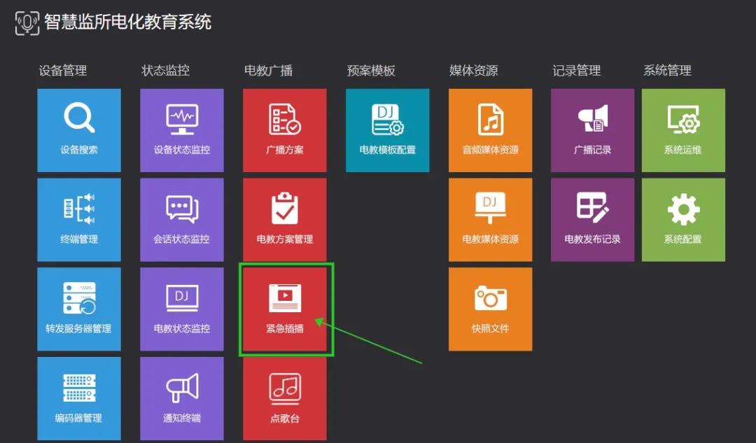 紧急插播:在紧急情况下支持对各监舍的终端进行紧急插播音视频,保证在紧急情况下优先权,紧急插播的优先级相对所有任务是最高的。紧急插播完可自动返回正常播放任务。