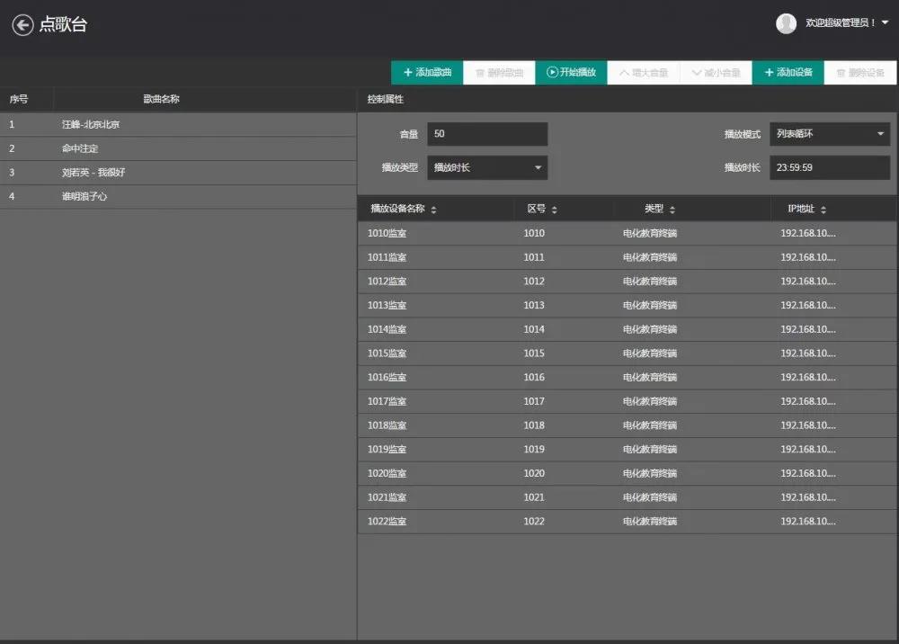 音频点歌:主控中心/分控中心可进入点歌台对任意监舍终端临时播放音频文件,终端接收播放指令后立即开始播放。