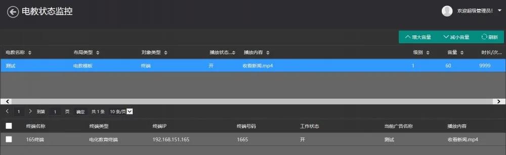 电教状态监控:实时监控所有电教终端当前播放状态、包括终端布局类型、播放内容、任务级别以及当前播放音量等参数进行实时监控。