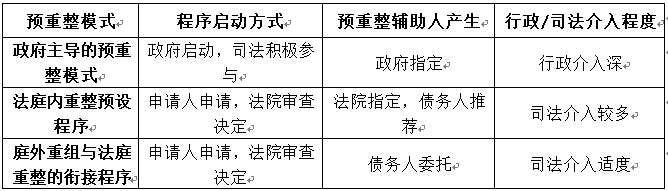 以上三种模式(破产重整预登记程序除外)实践中均有成功的预重整案例。三种模式差别主要体现在行政、司法干预程序不同,相应的比较如下: