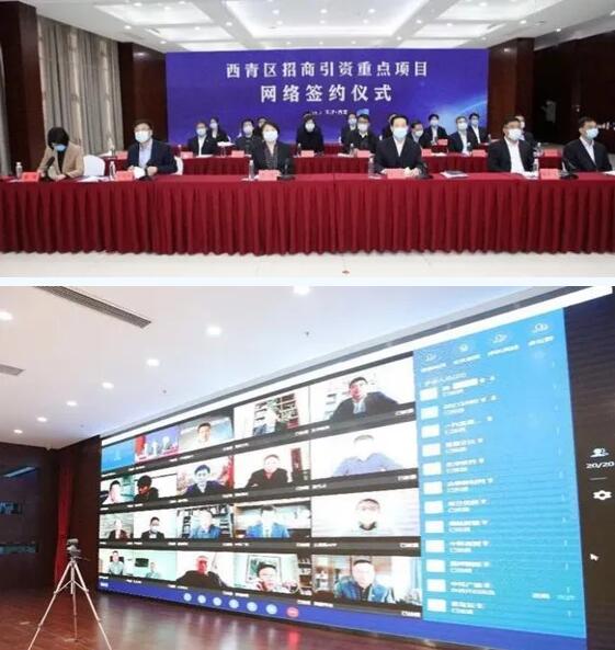 天津市西青区在蓝信平台上举办了“2020年招商引资重点项目网络签约会”。富晟赫千、每日优鲜、青旅文化等近20家企业在蓝信平台上通过连线,共同参加了此次网络签约活动。