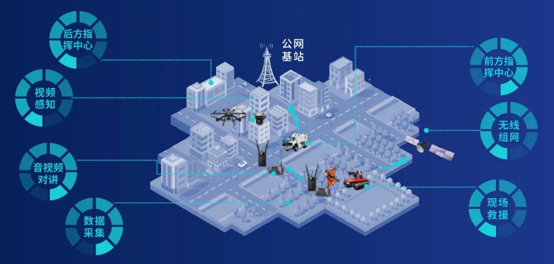 通过宽带、窄带自组网、卫星通信等设备实现应急现场快速无线组网,传递现场实时信息;智能消防机器人识别分析火灾现场的人员和热源,实现专业精细化灭火;无人机、移动布控球迅速捕捉现场视频感知数据,应急指挥车奔赴现场展开前后端协同指挥调度;多种应急救援装备联动,切实高效保障人民群众和救援队伍的生命财产安全。