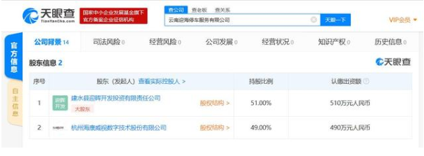 天眼查股东信息显示,该公司共有两大股东,第一大股东为建水县迎晖开发投资有限责任公司,持股比例51%;第二大股东为A股上市公司杭州海康威视数字技术股份有限公司,持股比例为49%。