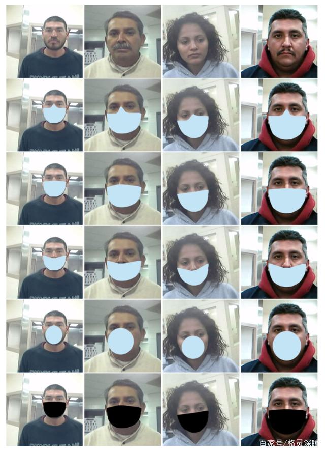在本次戴口罩人脸识别评测中,模拟口罩类型分三大类:宽口罩亮蓝色、圆口罩亮蓝色、宽口罩黑色。每个大类又分为LOW(低:口罩上边缘在鼻孔处)、MEDIUM(中:口罩上边缘在鼻头处)、HIGH(高:口罩上边缘中间处伸展到了两眼间)三种类型。