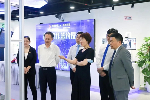 ▲科达董事长陈冬根一行参观创新奇智展厅