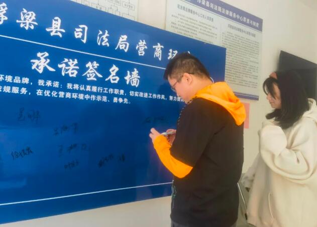 为持续打造“梁申办”营商环境品牌,11月1日,浮梁县司法局举办“营商承诺有我”活动,局领导干部参与承诺签名。