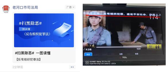 在线上,通过“老河口普法”微信公众号、微信朋友圈、电视网络飞字推送等功能,多层次、多角度地宣传了《反有组织犯罪法》应知应会的知识,积极引导广大居民深入学习,加强对该法的认知和理解。