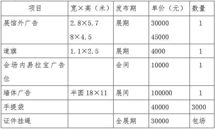 说明:标准展位9 M²(3*3),包括三面展板、一张洽谈桌、两把椅子、两支射灯、一个220V*5A电源插座、地毯(需向主办单位提供展位楣板文字,参加线下展赠送网上展)。