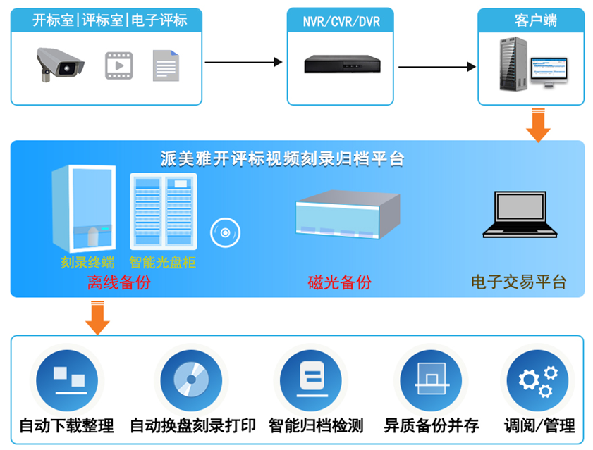 热烈祝贺派美雅开评标视频刻录归档平台落地应用在宜宾某公共资源交易服务中心,智能化一键刻录归档开评标音视频及电子文件,达到符合财政部令第87号与《中华人民共和国政府采购法》中采购文件的保存期限为从采购结束之日起至少保存十五年要求。支持自动无缝对接海康威视、大华、天地伟业等监控厂商及各种电子招标平台,打造一站式规划化刻录归档流程,融合一键归档、智能刻录、灵活打印、快速查询、智能可视化界面、实时交互、实时存档,无人值守等更强大功能于一体,有效协助某公共资源交易服务中心完成智能化升级改造。