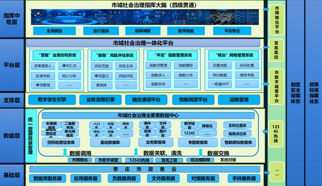 枣庄市市域社会治理现代化综合指挥平台的构成为“4个1”:1个应用支撑平台;1个市域社会治理大数据中心,主要承担数据标准化处理、数据库建设、数据共享交换中心建设;1个市域社会治理一体化平台,包含“慧聚”业务协同系统、“维稳”风险评估系统、“平安”指数管理系统、“精治”网格管理系统;1个市域社会治理指挥大脑,集运行监测、指挥调度、数字赋能、平安枣庄于一体,实现市、区(市)、镇街、村(社区)四级贯通。借助数据可视化等手段,进一步加强政法维稳、平安建设、社会治理等数据信息融合,强化预警预测预防,服务党委政府科学决策,助力达到枣庄市市域治理现代化的政治、自治、法治、德治、智治“五治融合”目标。