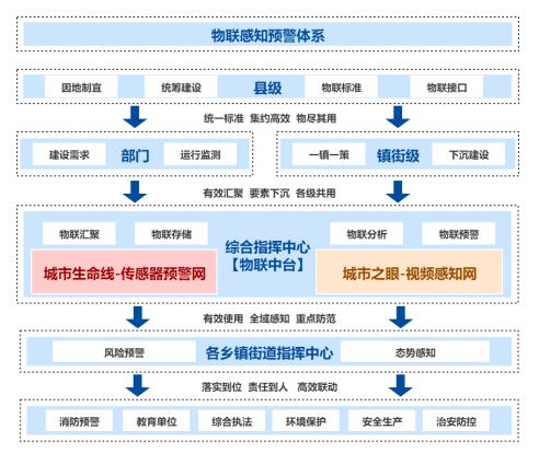 统筹建设物联顶层规划,统一各部门和镇级物联建设标准。一方面,各专业部门统一定制建设要求;另一方面,“一镇一策”精准建设,保证各镇级根据自身情况集约建设。通过物联中台构建基于传感器及摄像头的业务数据库、业务预警模型。建成后由相关部门结合业务运行保障、由物联中台保障监控感知稳定运行,由市、区/县、镇三级指挥中心指挥联动,将预警事件实时发现、上报、交办,联动相关部门协同处置,形成城市生命线预警、城市之眼感知的全息城市物联体系。