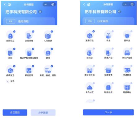 为避免一人作答受到风险认知的限制,问卷采取多部门协同作答模式。系统提供分享式答题功能,企业负责人可以分享对应模块给财务、法务等了解情况的人员完成评测,评测结果仅发起人可见。