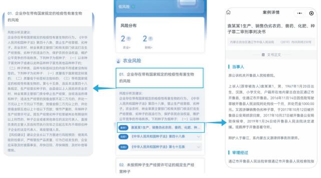同时可以作为政法委、检察院、司法行政等机关助力企业合规改革的应用,部署于政务大厅、官方网站、微信公众号等场景,供当地企业进行风险评测。