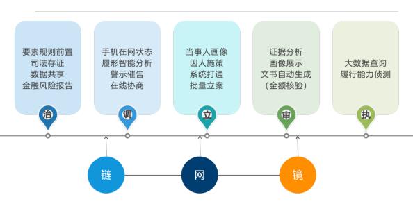平台由“链、网、镜”基础设施支撑,全程技术赋能,形成金融借款合同纠纷综合治理生态的“治理”、“调解”、“立案”、“审判”、“执行”五大板块。