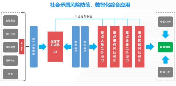 四、智能化的矛盾纠纷态势分析。系统依托先进的AI算法模型,可以对海量的各类数据和矛盾纠纷事件进行分析,并发出预警,让各级政法干部尽早介入并处置各类矛盾纠纷、安全隐患,做到“大事化小、小事化了”,减少极端案事件的发生。