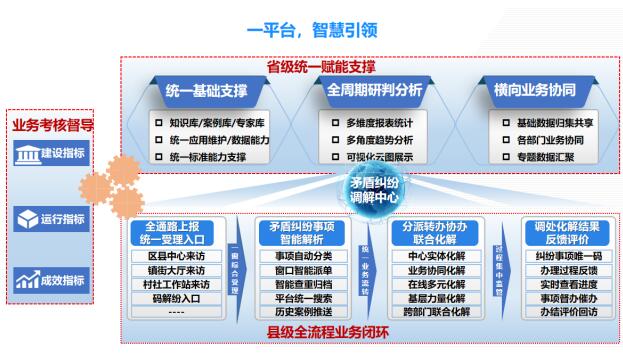 二、在省级层面强化制度设计,通过省级共享交换平台对接各职能部门的生产系统,实现矛盾纠纷信息多源汇聚,拓宽矛盾纠纷事件的线索来源。通过平台对矛盾纠纷精准派单,调度多部门协同参与化解,对处置情况进行实时跟踪,形成了矛盾纠纷化解的合力,解决以往各单位各自为政的情况。