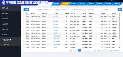 主要是对各方面上报的案事件进行分流转处、督办。事件来源共有三种途径,一是网格员通过手机APP日常排查上报。二是群众应用“丰景码上办微信小程序”进行上报。三是来源于区社会治理综合服务中心的来访群众。系统除常规的事件自动流转功能外,具备自动督办功能,根据系统自动计算,对事件办理时限进行红黄绿蓝四色提醒,红灯表示超期并自动提示,相关领导可在系统中直接发送督办信息,对督办信息处置不合格的事件可再次发起督办,相关督办信息会纳入绩效考核;黄灯表示即将超期给予预警提醒,提示尽快办理;绿灯表示事件正常,蓝灯表示已办结。通过信息化手段实现自动的提醒预警,并能及时监督监管,提高事件的处置效率及质量。具体包括:事件上报模块,为网格员、中心操作员提供事件上报的入口,当网格员巡查发现问题、中心操作员接收领导交办的问题时可以通过事件上报模块上报事件,登记的内容包括:事件名称、事件描述、事件级别、事发位置、事发时间、相关图片和录屏等。我的待办。对当前登录用户的待办事件的管理,包括待办事件的名称、发起人、接收时间、上报时间、处理时限、停留时长等信息,支持导出功能。用户可对待办事件进行审批处理,包括驳回和处理功能,除此之外,还可以实时查看各个节点的审批意见及流程图。我的经办。对当前登录用户的经办事件的管理,包括已办事件的流水号、事件名称、发起人、上报时间、完成时间等信息,支持导出功能。点击任一条事件数据可查看其处理详情。我的办结。显示当前登录用户已经办结的事件信息,包括已办结事件的流水号、事件名称、发起人、接受时间、上报时间,支持导出功能。点击任一条事件数据可查看其审批全流程信息。事件总览。对当前登录用户所涉及到的所有事件的管理,包括事件流水号、事件名称、状态、事项类别、事项、状态、上报时间、上报人等信息,支持导出功能。超时监控,针对事件处理的各个环节设置规定完成时间,设定预警规则,当达到预警条件则提前进行预警展示。对于正常事件给予绿灯提示,对于快超期事件给予黄灯提醒,对于超期事件给予红灯提醒。监察督办,当领导发现事件较为严重时,可以将该事件定为督办事件。当定义为督办事件后,该督办事件的账号下用户可查看到督办事件显示督办提醒。