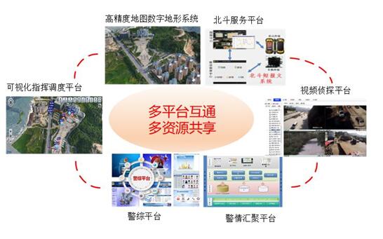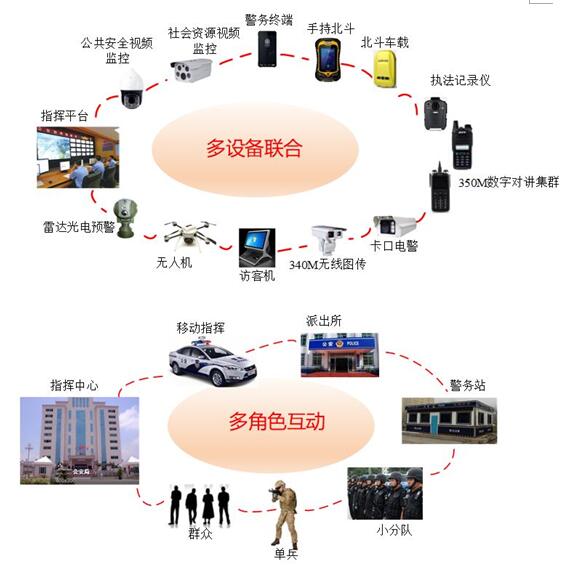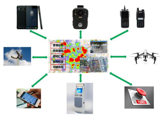 为实现可视化合成指挥调度等功能,本系统对各种资源、各种设备、各种平台进行了有效整合,确保协同作战的能力。在指挥中心的统一指挥下,联合利用警务终端、摄像头、无人机、集群对讲多种设备,相关警种各尽其责,整体联动,协同作战,真正形成打击合力。