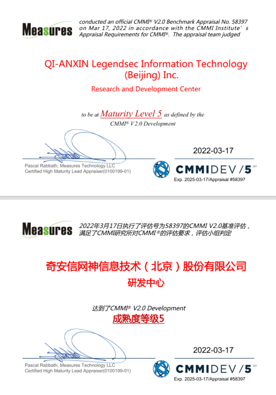 近日,奇安信正式通过全球软件工程领域最高级别CMMI–DEV V2.0成熟度5级评估认证。早在2018年,奇安信首次通过CMMI V1.3成熟度评估,本次顺利通过CMMI-DEV V2.0成熟度5级评估,标志着奇安信在软件工程技术研发能力、软件过程组织能力、项目管理能力、方案交付能力等方面持续位居国际先进水平,研发成熟度再次获国际权威认可。