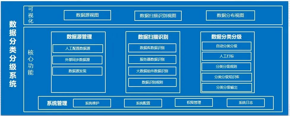 数据分类分级系统主要由可视化管理、数据源管理、数据扫描识别、数据分类分级和系统管理五部分组成。系统技术体系架构如下: