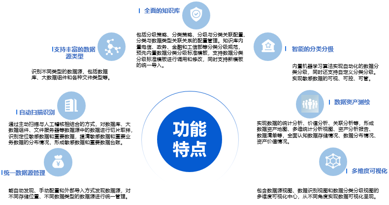 数据分类分级是数据安全治理的前提也是关键一个环节,它既是组织内部管理体系制度的基础,又是技术工具体系落地实施的支撑,可以帮忙组织快速梳理组织内数据在存储、使用、共享过程中存在数据资源管理混乱、敏感/重要数据分布不明、数据分类分级工作难、耗时高等问题。天榕数据分类分级系统具有以下功能特点: