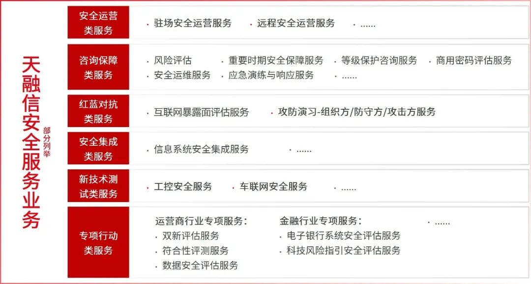 天融信通过深度参与该标准的研制,梳理了各类应用场景中安全服务活动的性质和特点,为广大用户提供安全运营、咨询保障、红蓝对抗、安全集成、新技术测试、专项行动等六大类安全服务,并以安全运营、红蓝对抗、新技术检测为持续创新、突破的关键点。