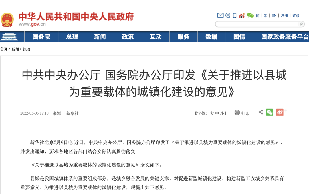 2022年5月6日,中共中央办公厅、国务院办公厅印发了《关于推进以县城为重要载体的城镇化建设的意见》,并发出通知,要求各地区各部门结合实际认真贯彻落实。