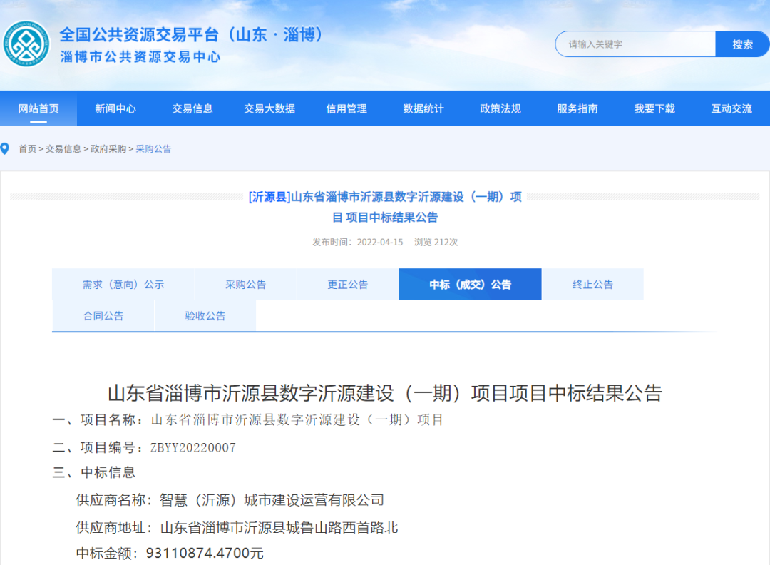 数字政通参股公司智慧(沂源)城市建设运营有限公司于2022年4月15日通过公开招标形式中标山东省淄博市沂源县数字沂源建设(一期)项目,中标总金额 93110874.47元。将以“优政、惠民、兴业、强基”为统领,建设1个数字沂源综合运营指挥中心,以一网统管综合指挥平台和数据资产平台2个核心平台为基础,通过业务中台、AI中台、IoT中台3个中台赋能,打造城市综合管理服务平台、视频汇聚平台、公安全目标视频智能解析平台、智慧交通电子公交站牌、智慧社区、融合通讯系统、应急指挥调度系统等智慧应用,提升沂源县城市智慧化水平。