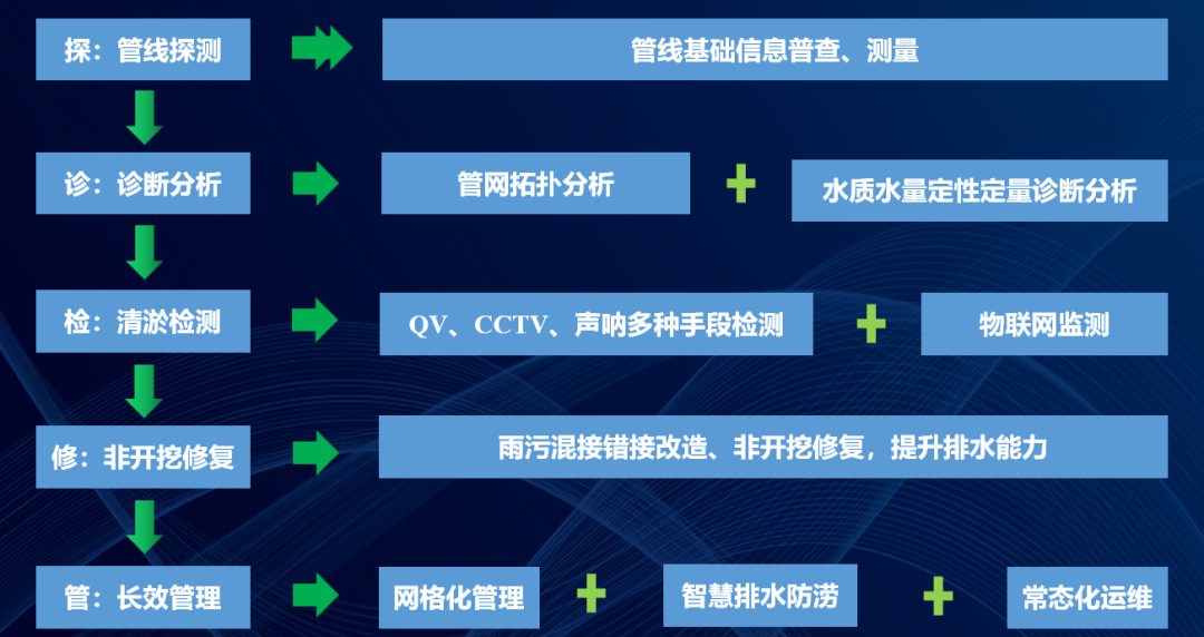 城镇污水处理提质增效一体化治理。基于公司管线和排水多年的行业经验,充分利用物联网、云计算、大数据、人工智能等科技手段,构建“探·诊·检·修·管”一体化解决方案,开展摸清家底、管网监测、溯源排查、检测修复等一系列措施,系统解决排水管网问题。打造从管网工程服务、智慧化管理到常态化运维的一站式服务能力。通过智慧排水平台,建设涵盖基础数据管理、数据分析、综合展示到巡查工单、隐患排查、排污许可、厂站监管等全要素、全业务的管理平台,实现排水系统科学的治理,达到排水“标本兼治”的治理目标。