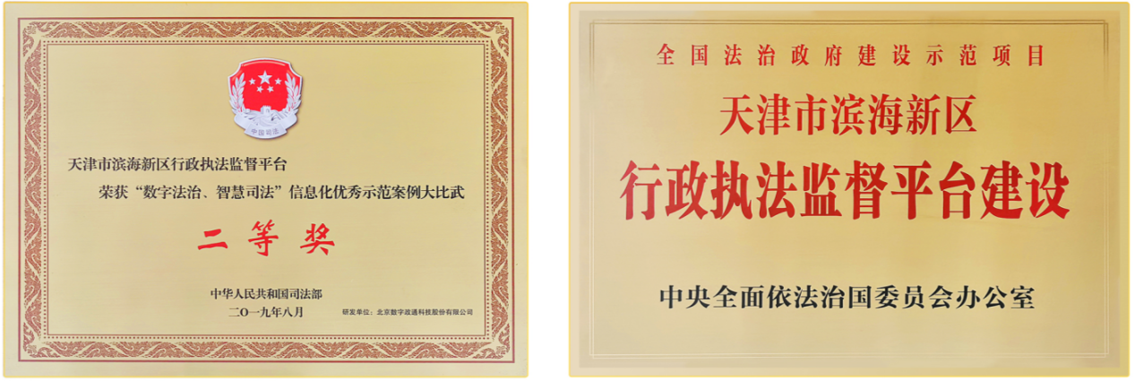 近年来,行政执法监督平台作为各地法治政府创建的重要抓手,先后有天津滨海新区、天津市、河北省、长沙市、衡阳市、贵州省、宁夏自治区、中卫市等地司法行政机与数字政通进行合作并落地了省级、地市级行政执法监督平台,其中数字政通于2015年承建并上线运行的天津市滨海新区行政执法监督平台,先后荣获了全国智慧司法十大创新案例奖,全国首届数字法治、智慧司法信息化大比武二等奖,2020年被中央全面依法治国委员会评为全国第一批法治政府建设示范项目。