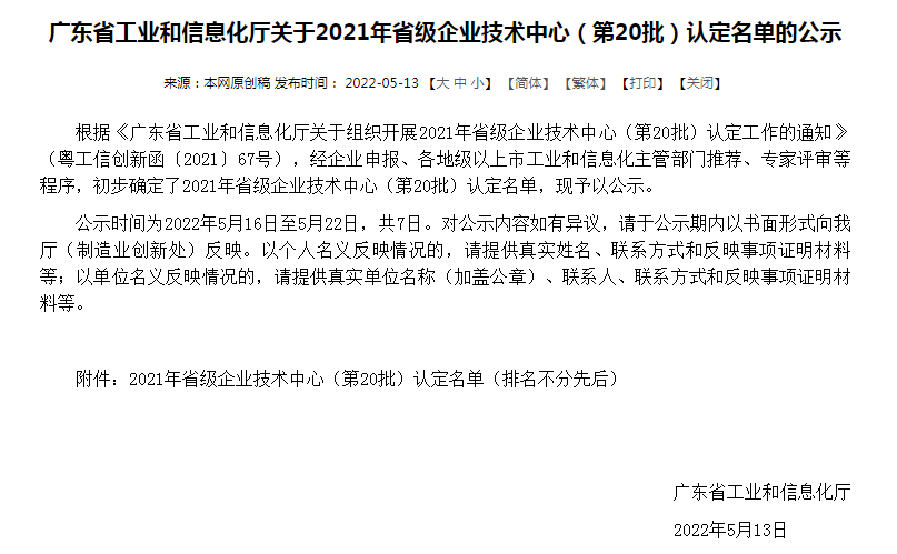 2022年5月13日广东省工业和信息化厅公示了
