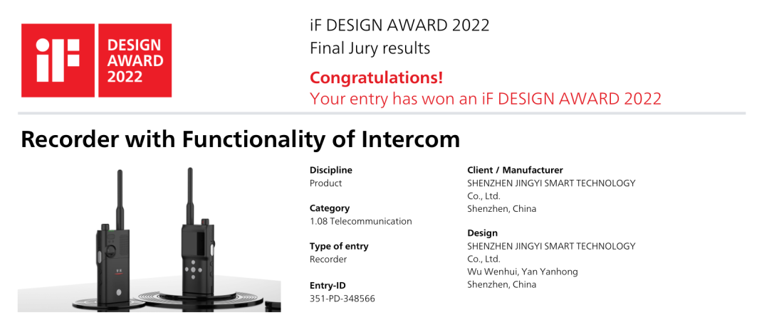 作为极具知名度和权威性的奖项,两者对入围作品的考察十分严格,概念、外观、功能、创新、影响五大评判维度缺一不可,唯有全面均衡的表现才能获得评审团青睐。警翼战略新品对讲记录仪X5能在强者如云的竞争中脱颖而出,无疑是对对讲记录仪X5的产品外观及功能质感最具权威的证明。