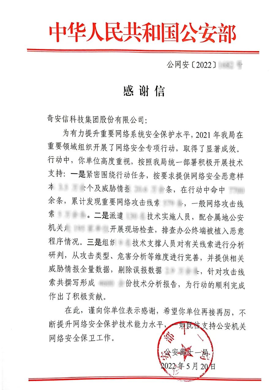 近日,公安部向奇安信集团发来感谢信,以表彰奇安信在2021年公安部网络安全专项行动中,支持网络安全保卫工作所做出的积极贡献。作为新一代网络安全企业,奇安信充分发挥自身优势,组织专业力量,调动资源,全面支持专项行动,并圆满完成任务。